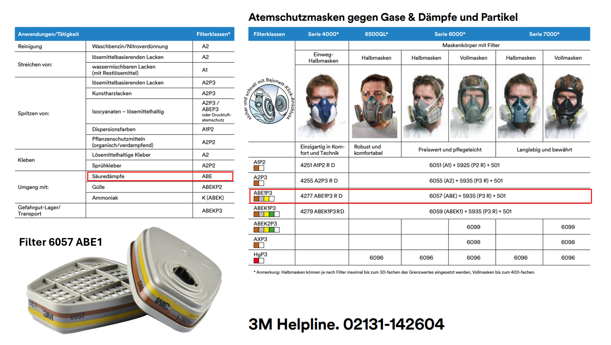 Quando si lavora con i vapori di acido ossalico la scelta dell'attrezzatura di protezione è fondamentale. 3M offre una gamma di filtri che proteggono da vapori pericolosi. Per i vapori di acido ossalico è particolarmente importante scegliere la corretta classe di filtro (ABE).