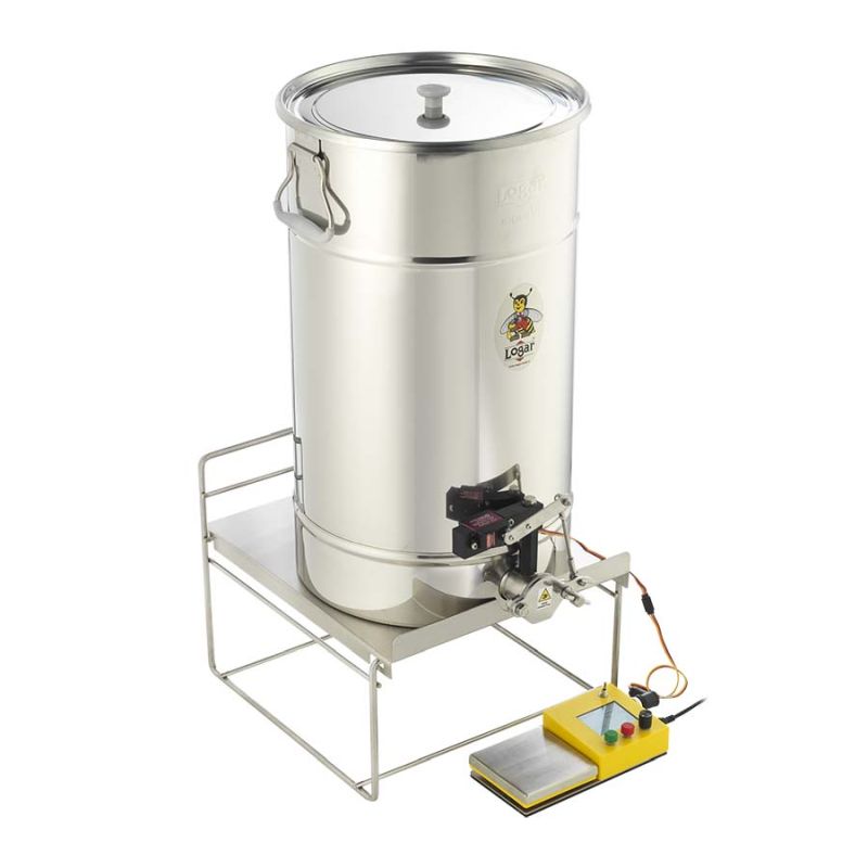 L'impianto è montato sul nostro serbatoio di riempimento da 50 kg con fondo inclinato per un flusso più agevole. Un servomotore montato sulla tubazione di uscita gestisce la chiusura del coperchio del rubinetto a spremitura. Il dosatore è progettato per il riempimento semiautomatico di miele o di altri liquidi dalla consistenza viscosa.