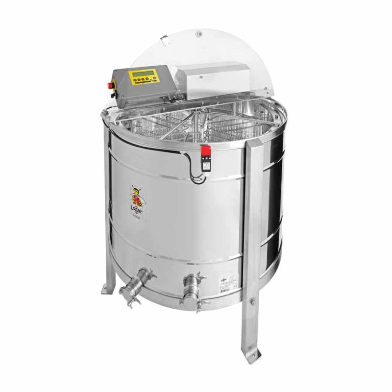 Estrattore auto-invertente per 6 favi Logar, con motore 250 W / 230 V, controllo completamente automatico e dispositivo di sicurezza integrato che spegne automaticamente il motore all'apertura del coperchio. L'estrattore è dotato di due rubinetti a compressione 6/4''; uno è montato nel punto più basso per permettere lo scarico completo del miele. Tutte le parti a contatto con il miele sono realizzate in materiali idonei al contatto alimentare. Il coperchio è in acrilico trasparente.