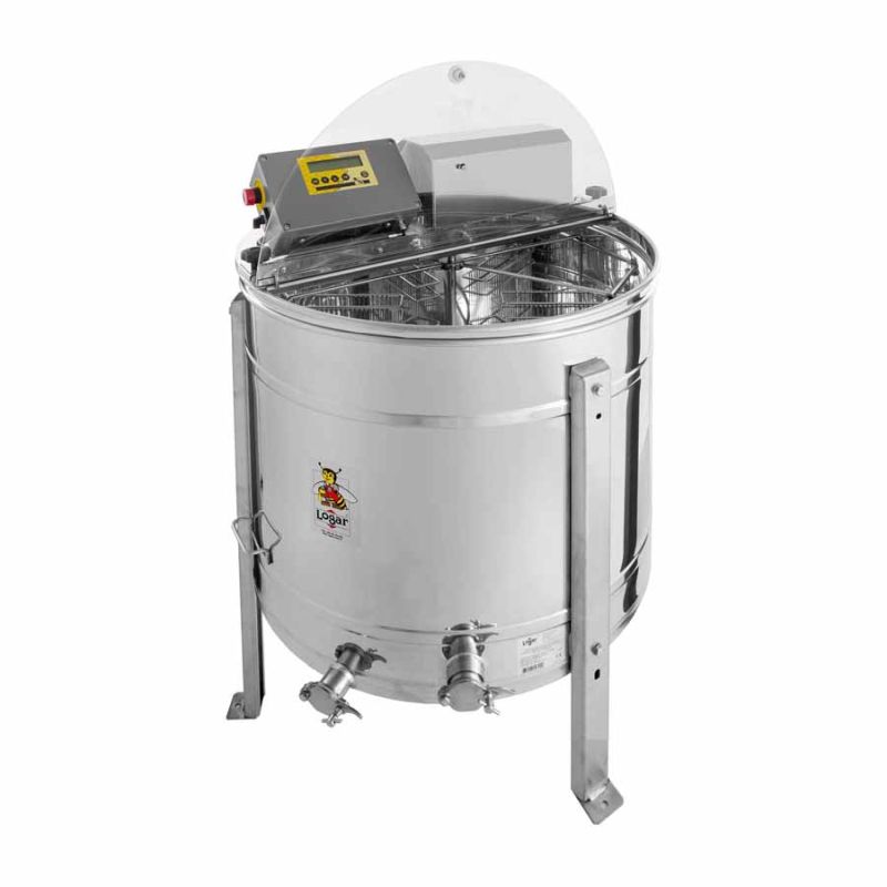 Estrattore a 4 favi con ribaltamento automatico, azionato da motore 180 W / 230 V e dotato di controllo totalmente automatico. È dotato di un interruttore di sicurezza integrato che arresta automaticamente il motore all'apertura del coperchio. La tecnica più moderna ci ha permesso di sviluppare in modo innovativo il fondo della vasca. Il fondo della vasca è saldato senza giunture e inclinato verso lo scarico. Il rubinetto a compressione in acciaio inox è posizionato nel punto più basso possibile affinché tutto il miele possa defluire completamente dall'estrattore. Tutte le parti dell'estrattore che vengono a contatto con il miele sono realizzate in materiali approvati per uso alimentare. Il coperchio è in acrilico trasparente. Questo estrattore permette di lavorare telai di maggior altezza fino a 28,6 cm. Per questo motivo il coperchio si apre sopra il motore mediante speciali cerniere.