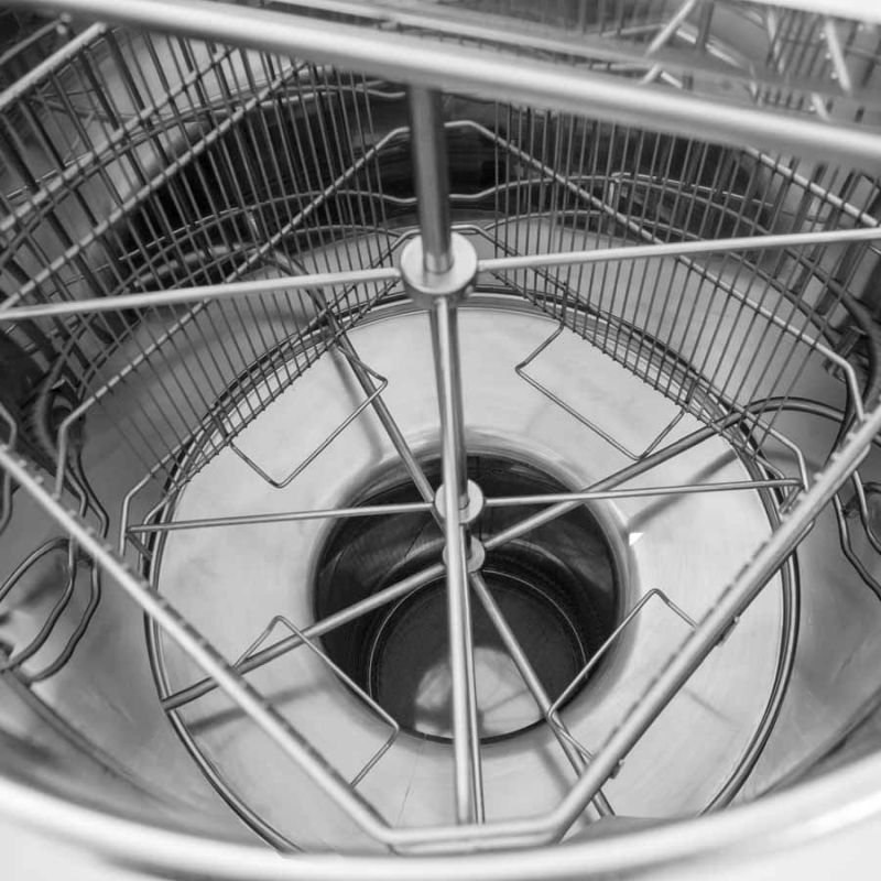 - ELEVATA STABILITÀ DELL'ESTRATTORE DURANTE LA ROTAZIONE: il peso del miele nella tanica stabilizza l'estrattore durante lo svuotamento e permette all'apicoltore di raggiungere regimi più elevati — un chiaro vantaggio rispetto agli estrattori tradizionali non appesantiti.