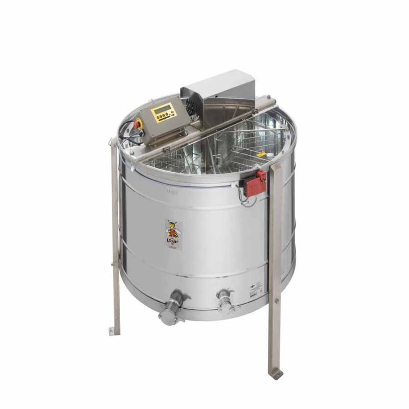 Estrattore auto-inversione 8 favi di Logar, dotato di motore 370 W / 230 V, comando totalmente automatico e dispositivo di sicurezza integrato che arresta automaticamente il motore all'apertura del coperchio. La tecnologia più moderna consente una soluzione innovativa per il fondo dell'estrattore: saldato senza giunzioni e inclinato verso lo scarico. L'estrattore è provvisto di due rubinetti di scarico in acciaio inox (Ø 6/4'' e 2''); il rubinetto a compressione da 2'' è installato nel punto più basso possibile per consentire il completo svuotamento del miele. Tutte le parti a contatto con il miele sono realizzate con materiali idonei per uso alimentare. Il coperchio è in acrilico trasparente.