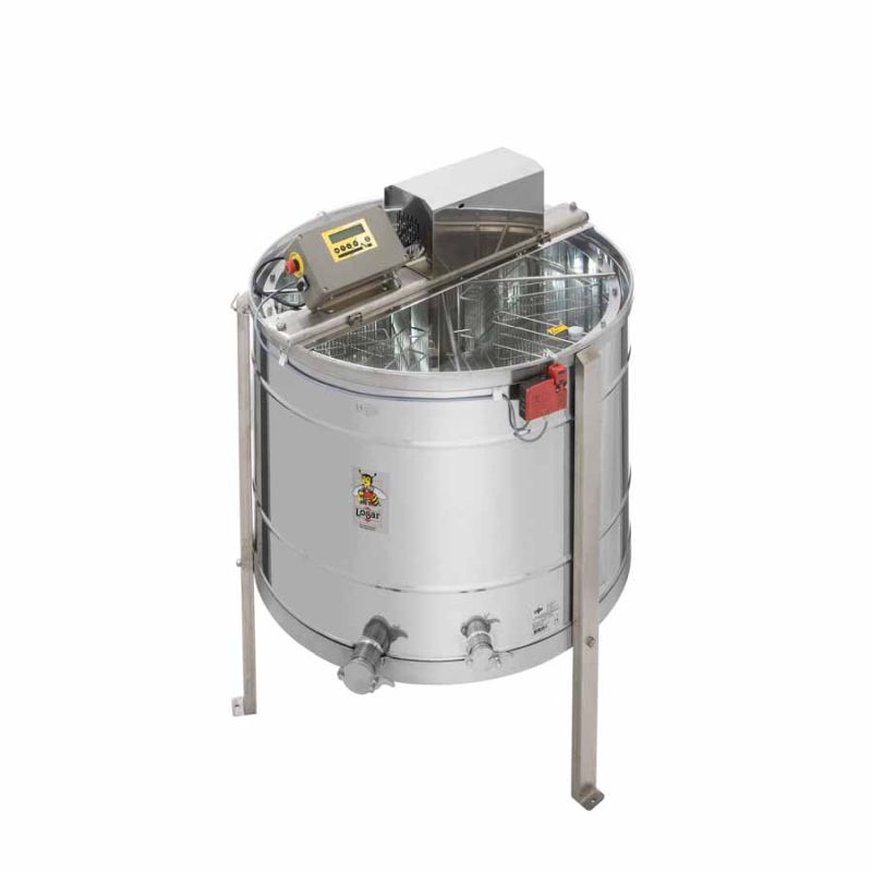 Smielatrice a inversione automatica a 6 telaini Logar con motore 370 W / 230 V e comando totalmente elettronico. La centrifuga è dotata di un dispositivo di sicurezza integrato che arresta automaticamente il motore all'apertura del coperchio. Fondo vasca moderno: saldato senza giunzioni e inclinato verso lo scarico per un ottimo deflusso del miele.